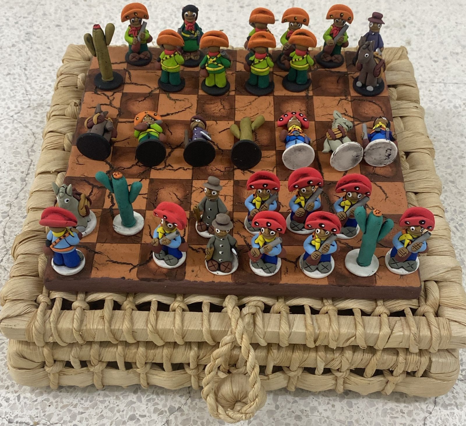 Jogo de xadrez estilizado feito por um artista popular nordestino que trabalha com artesanato usando palha e outros materiais.
